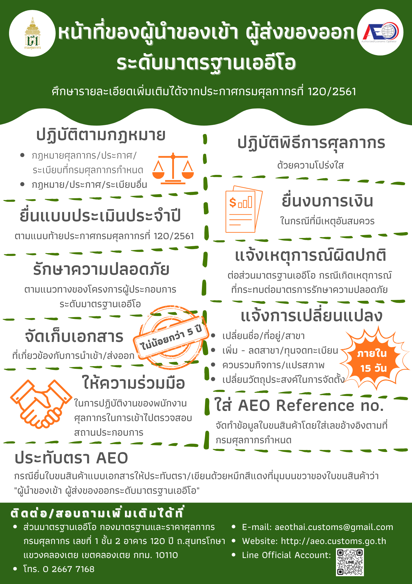 หน้าที่ของผู้นำของเข้า ผู้ส่งของออก และ ตัวแทนออกของระดับมาตรฐานเออีโอ ตามประกาศกรมศุลกากรที่ 120/2561 และ 121/2561